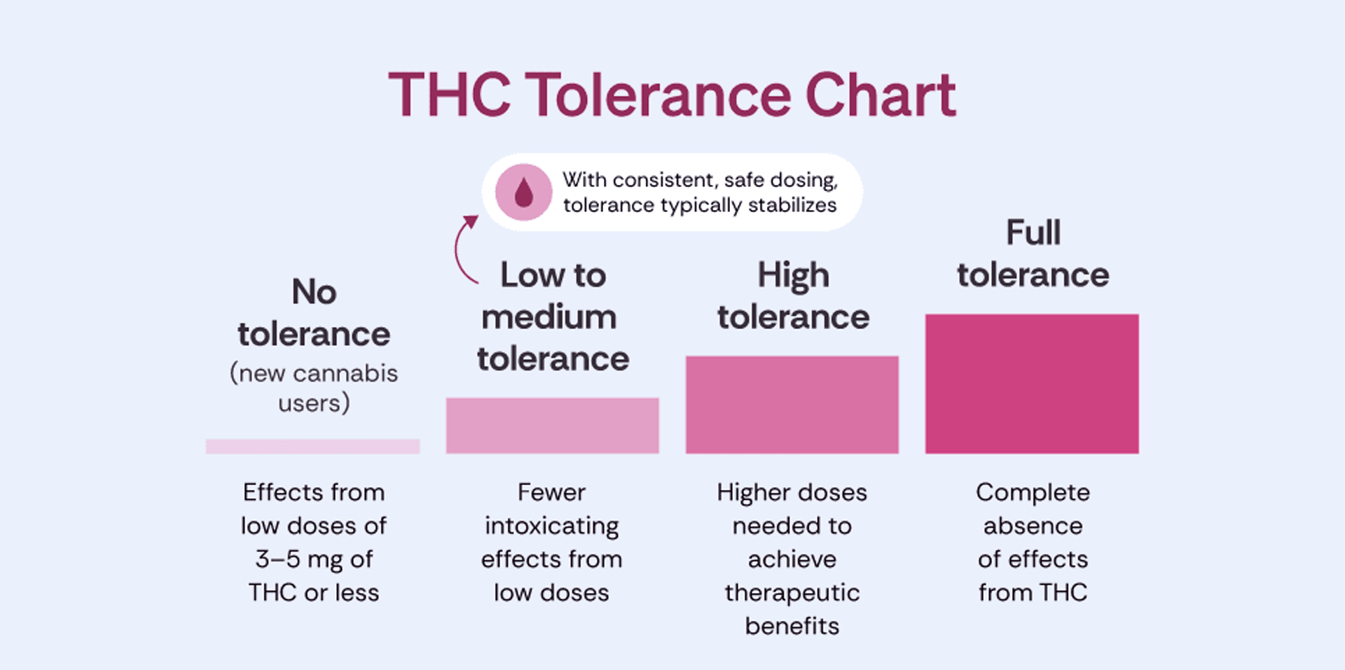 • Behavioral tolerance is linked to repeated exposure: Human studies support the idea that consistent high-dose THC use is associated with greater tolerance and that tolerance diminishes with reduced use.